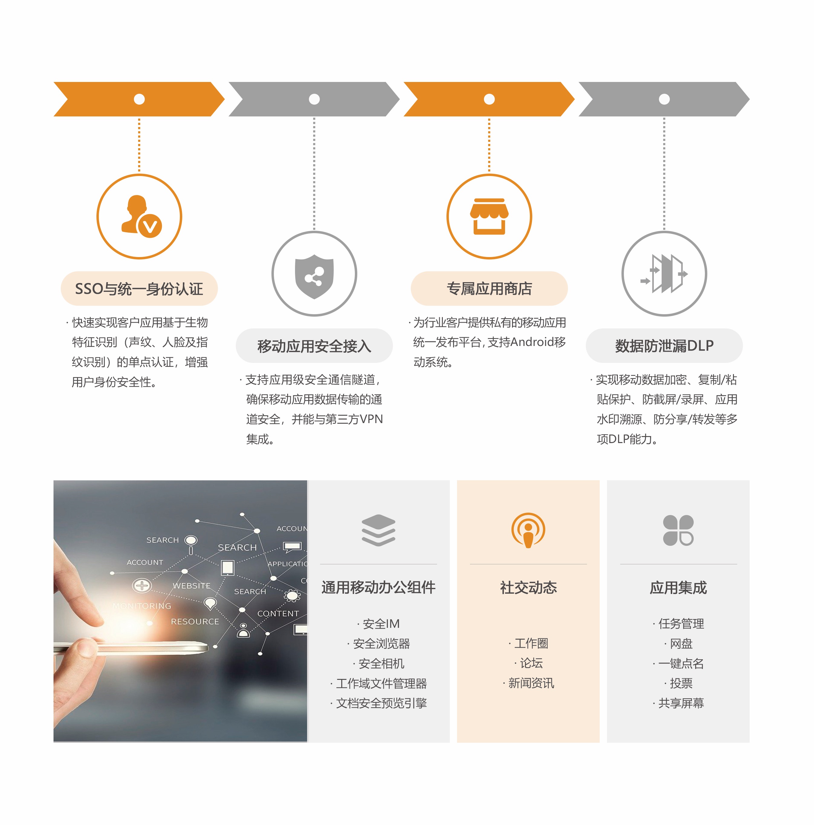統一移動安全門戶客戶端軟件(APP)方便用戶通過移動智能設備安全地接入內部業務,隨時隨地處理工作事務、訪問內部資源;提供開發者門戶服務,方便應用的維護與管理,為所有業務應用提供豐富的管理能力和輕量級的服務入口,使資源利用更高效、更便捷。
